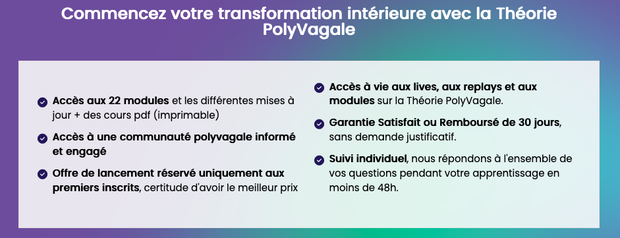 Basée sur les recherches révolutionnaires de Stephen Porges, la Théorie Polyvagale vous révèle comment votre système nerveux autonome (SNA) pilote votre bien-être émotionnel, vos relations et votre santé de manière plus globale.